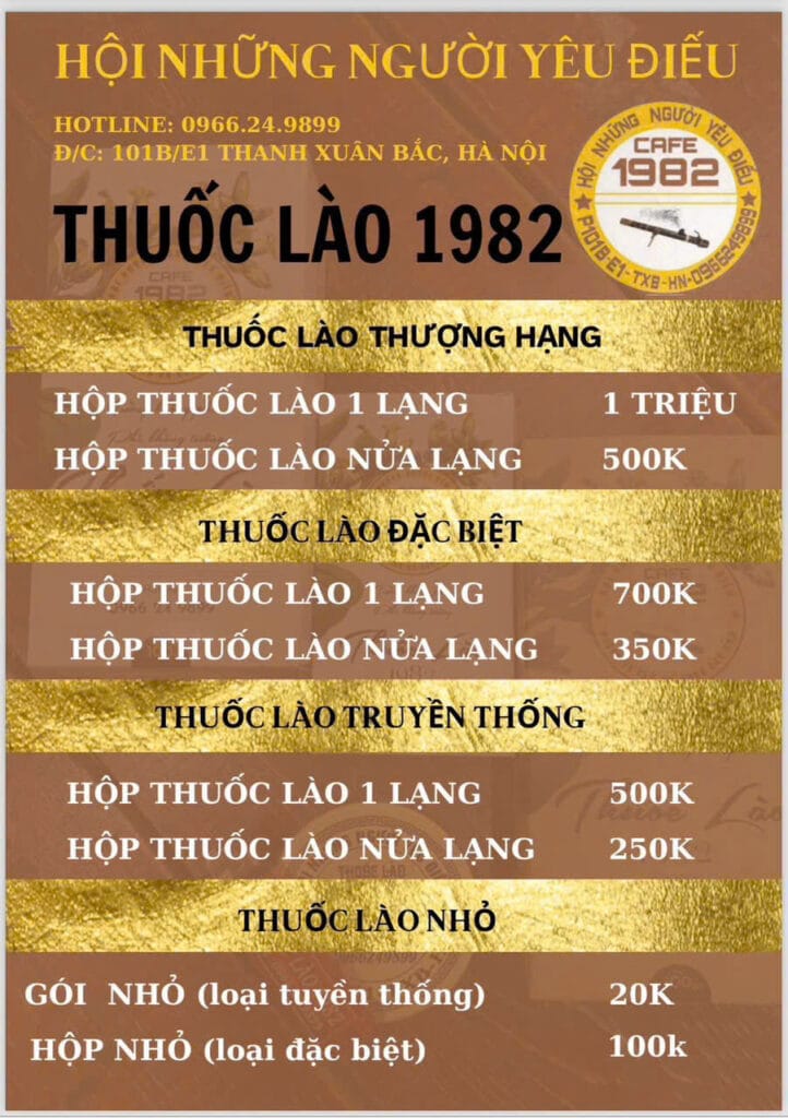Thuốc Lào 1982 không chỉ là một sản phẩm, mà còn là biểu tượng của văn hóa thưởng thức thuốc lào dành cho những người đam mê điếu cày tại Hà Nội. Chúng tôi tự hào là đại lý chính hãng của thương hiệu 1982, mang đến các sản phẩm chất lượng cao, được tuyển chọn kỹ lưỡng, đảm bảo trải nghiệm êm – đậm – chất.